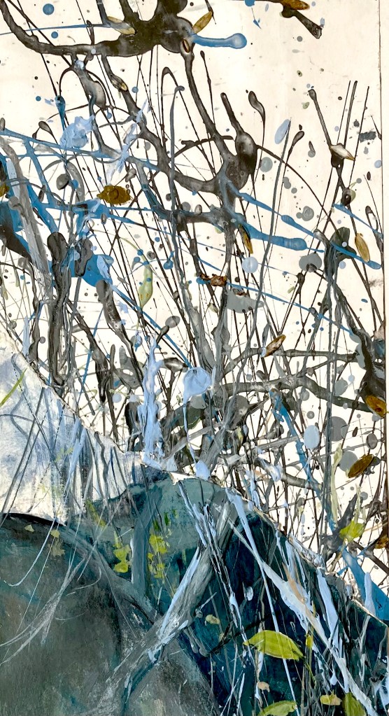The Grampians ‘Mountain Scramble’. 33x43cm (framed) SOLD ‘A scribble of branches’, collage, SOLD. ‘Firewall’. SOLD. Approx 1 metre high. Acrylic on paper.